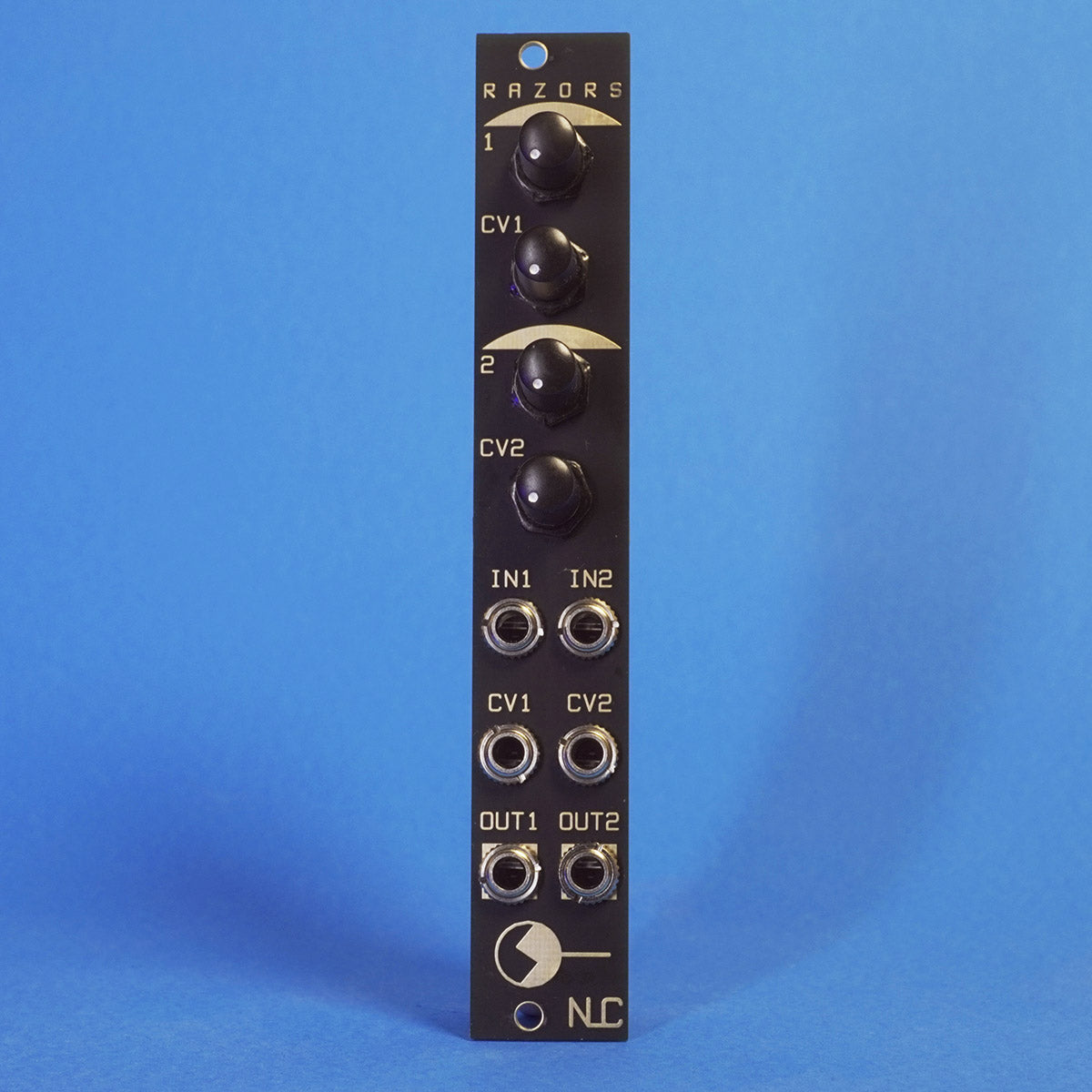 This is a dual voltage controlled version of Razor on the Tinkle module. I have always enjoyed the Razor, especially when used with fast drum patterns, so it was inevitable this module would happen.