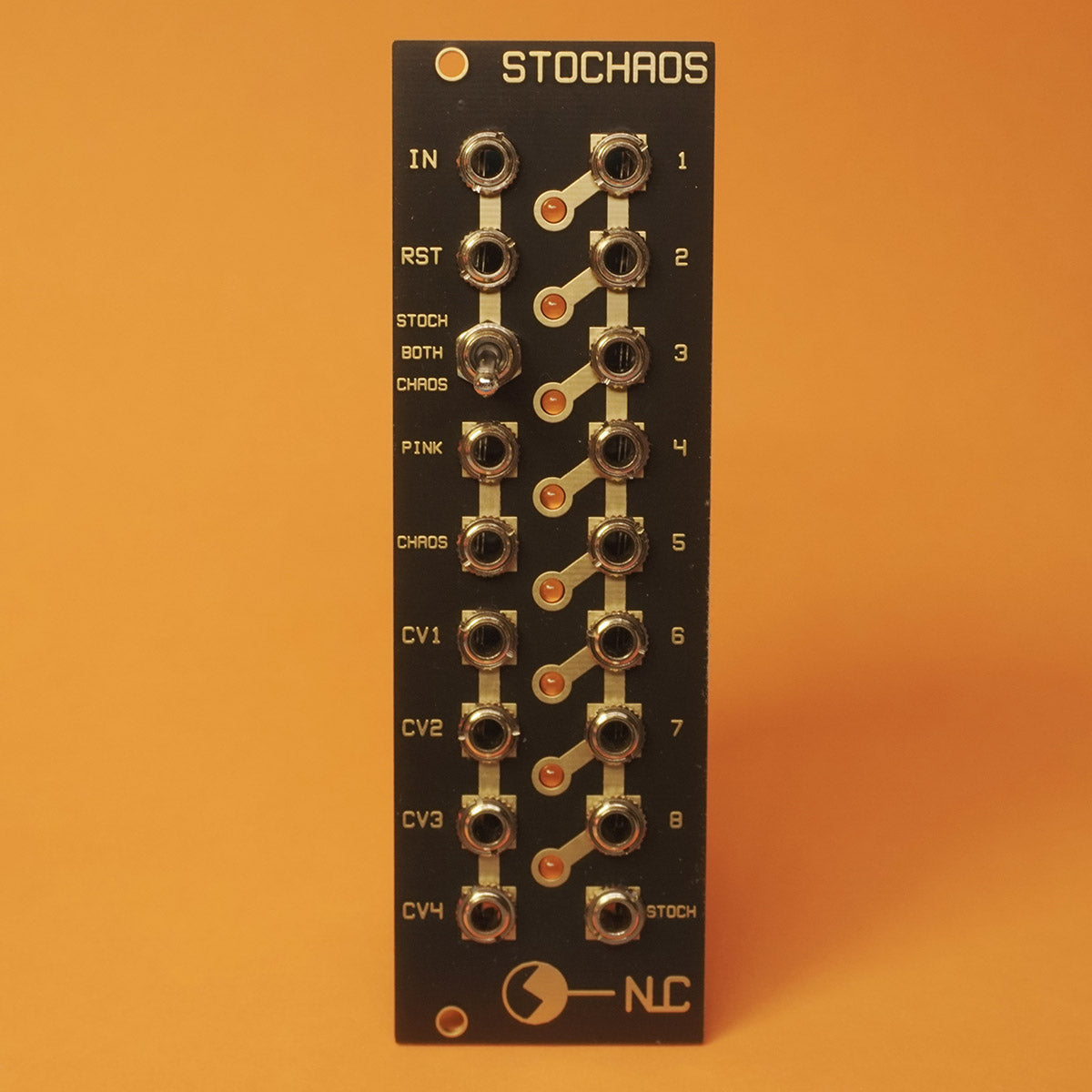 This module generates gates and control voltages based on pink noise or chaos or pink noise vs chaos. You can use a switch to select which variation. To operate, just feed a gate to IN, add a reset if you like. Select if you want full random (STOCH), chaos or random vs chaos (BOTH).